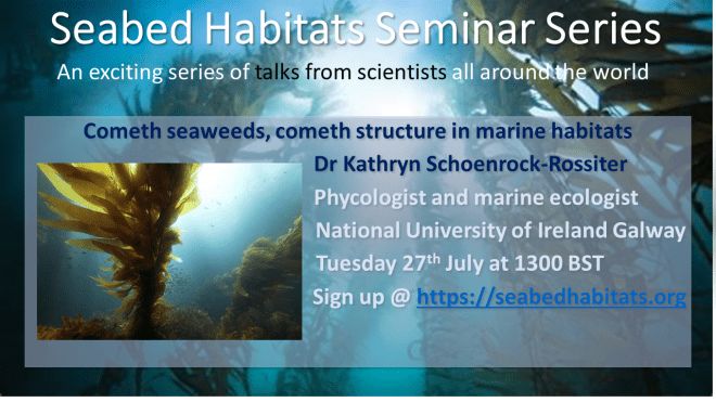 Pleased to invite you to a seminar by Dr Kathryn Schoenrock, who is the EPA-Ireland, Primary Investigator and Postdoctoral Researcher at National University of Ireland (NUI) Galway, on Tuesday 27th July at 1300 BST. The webinar is entitled “Cometh seaweeds, cometh structure in marine habitats.”